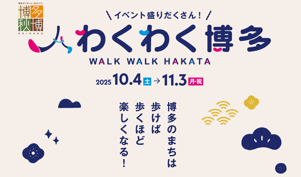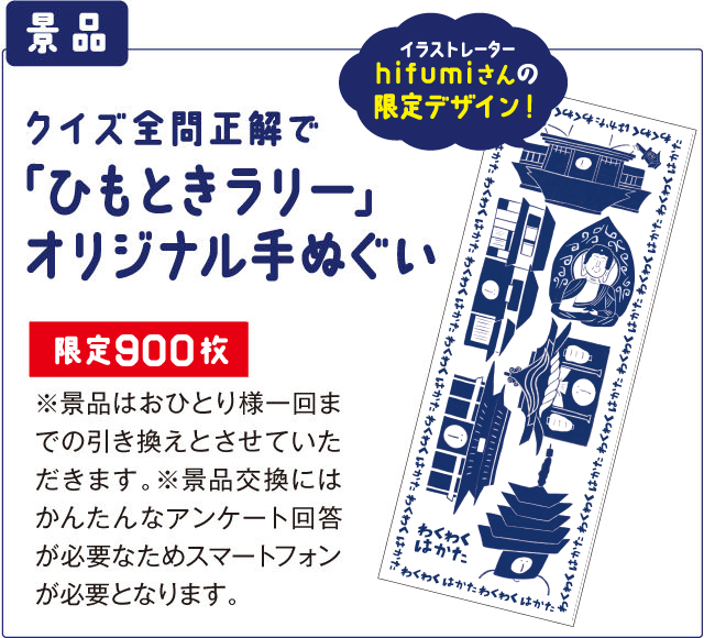博多にまつわるクイズに答えながらまちを巡り、まだまだ知られていない博多の伝統や文化などの魅力をひもとくクイズラリーです。全5か所のクイズスポットにある解答用紙に答えを記入し、「博多町家」ふるさと館で答え合わせとかんたんなアンケートを。5問正解で、オリジナルの博多デザイン手ぬぐいをプレゼント!