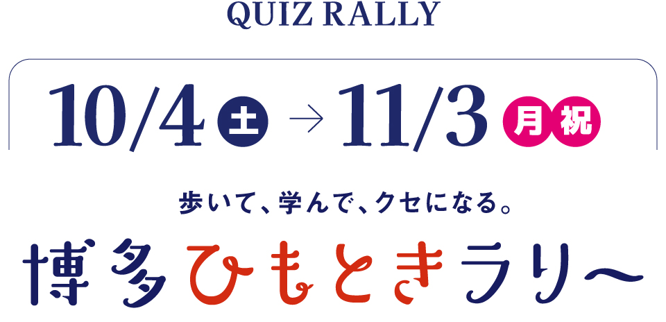 博多にまつわるクイズに答えながらまちを巡り、まだまだ知られていない博多の伝統や文化などの魅力をひもとくクイズラリーです。全5か所のクイズスポットにある解答用紙に答えを記入し、「博多町家」ふるさと館で答え合わせとかんたんなアンケートを。5問正解で、オリジナルの博多デザイン手ぬぐいをプレゼント!